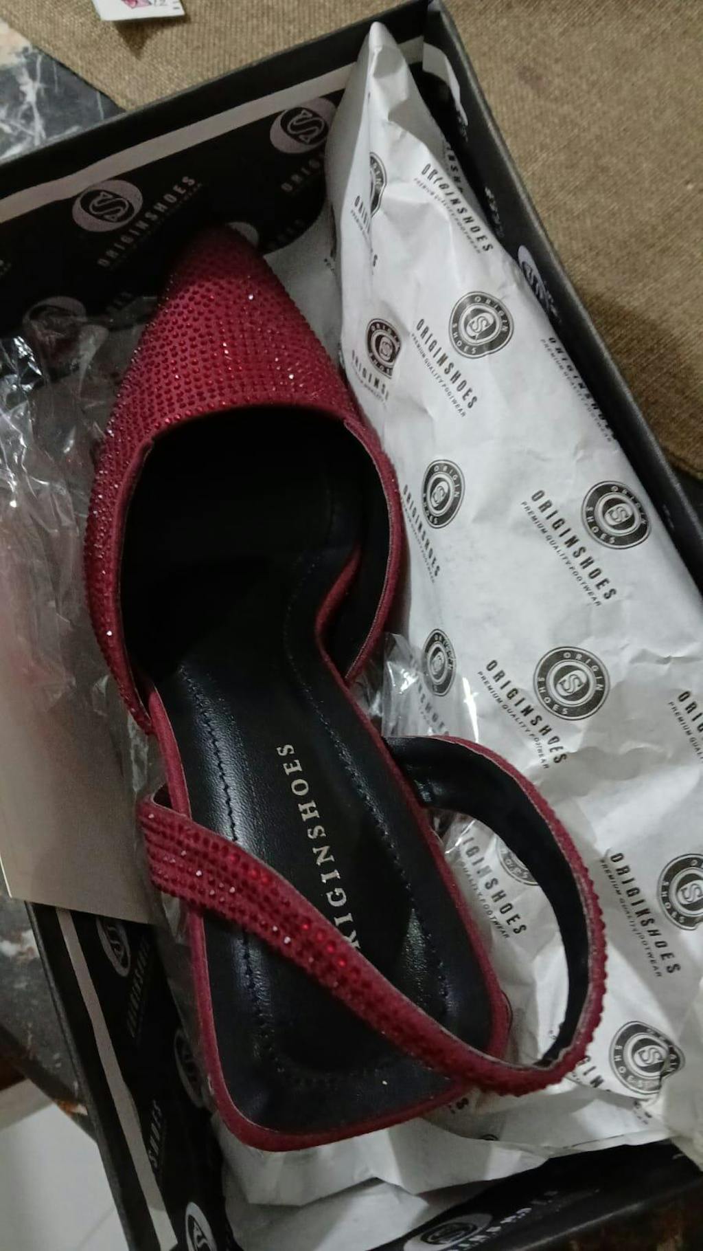 Step into style with Origin Shoes' Maroon Crimson Dazzle Slingback Heels. Designed with premium materials and a chic 2.5-inch heel, these sandals offer the perfect balance of comfort and glamour. Ideal for weddings, parties, and festive events. Enjoy fast delivery across Pakistan.